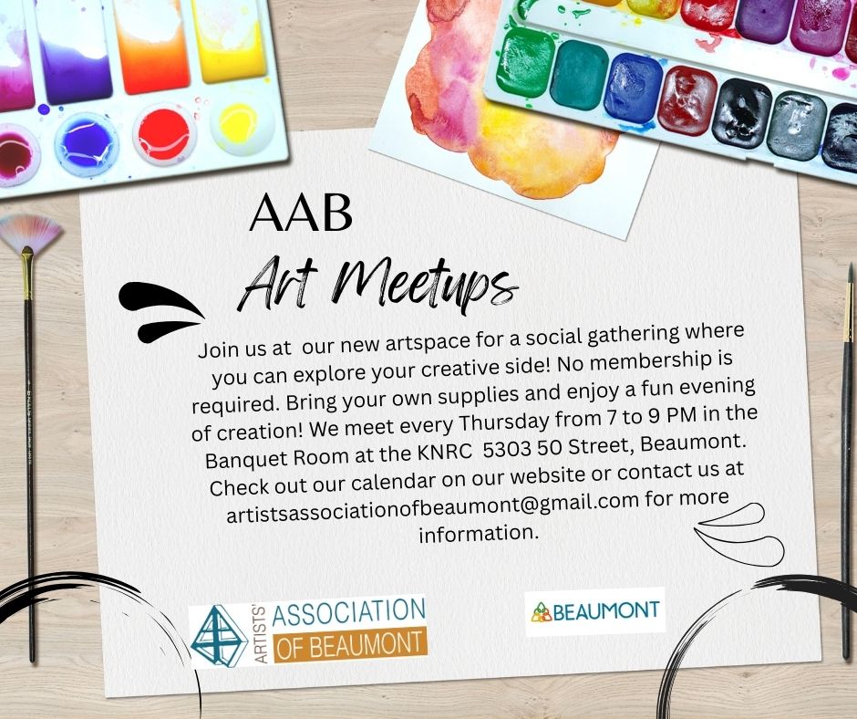 Come join in on the fun! We meet every Thursday from 7 to 9 PM in the Banquet Room at the KNRC 5303 50 Street. Beaumont. Check out our calendar on our website or contact us at artistsassociationofbeaumont@gmail.com for more information. A special thanks goes to the City of Beaumont for their continued support of our organization. These meetups are funded in part by the Beaumont Arts Grant.