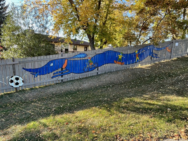 One project was recently completed that we call “Big Blue”. Big Blue, a large fence mural on the southwest corner of Bellevue School hill, was the inspiration of Laurel Aitken who took her time thinking about the message she wanted to share with her fence mural. “With my fence facing the school, I knew we wanted it to reflect something that children would enjoy and also the numerous dog walkers that travel the trail pathway beside the fence. Our fence is extra long, so we knew we wanted something that would be suitable for that length and that’s when the idea of a wiener dog came to be!” It perfectly fit the concept Laurel had in mind, with it being playful artwork that children and dog walkers alike could enjoy and reflect upon. Once the idea was conceived, Laurel and her mentor Christie Jedele (expertise with past experience in building murals) proceeded with the many hours of work, along with help from her family and Stacey Oswald. Altogether it took about 10 days of steady work, and Big Blue was born! The response from the neighbourhood has been so positive, with so many people stopping to comment and enjoy the progression and end result.