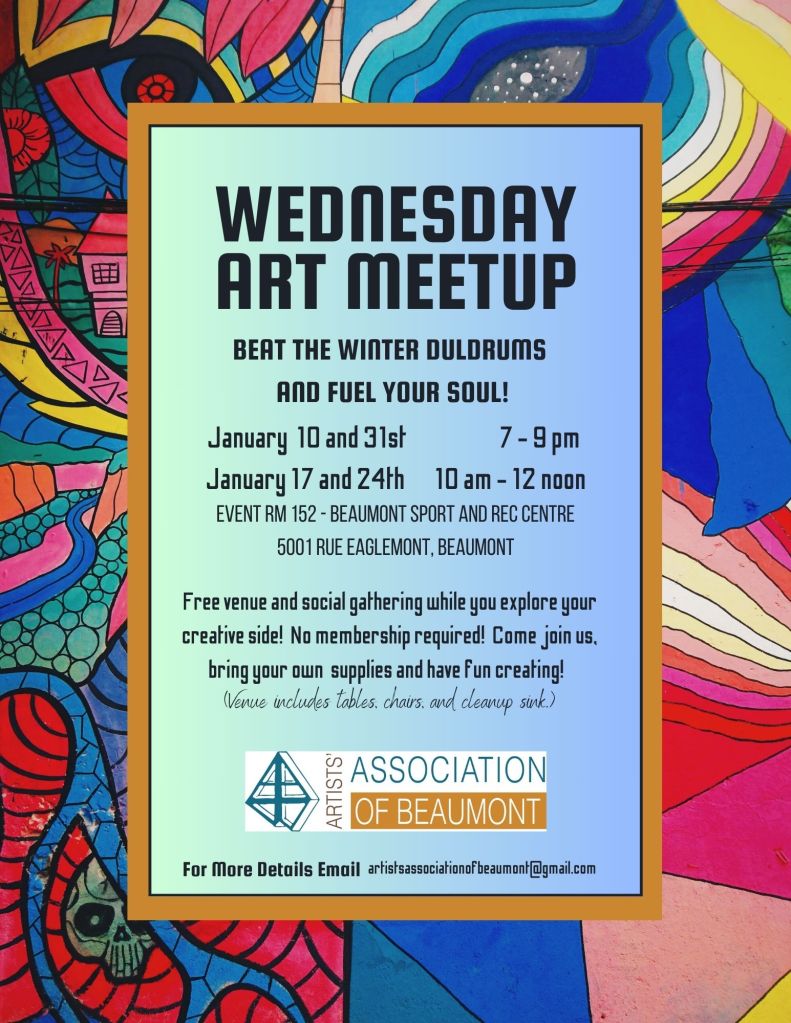For the month of January – Jan 10 and 31st, we meet at 7 pm to 9 pm. Jan 17 and 24, we meet at 10 am to 12 noon. The schedules are regularly updated on our Facebook/Instagram page and website. If you have any questions about Wednesday Art Meetup, contact the AAB via email, at artistsassociationofbeaumont@gmail.com.