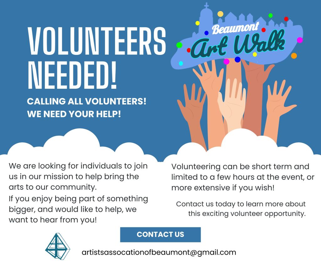Our volunteer base was awesome last year and we are hoping to get even more people involved this year. Perks of volunteering include a free lunch, a commemorative T-Shirt and just plain old fun hanging out with artists and the community! We accept individuals 14 years or older, and under 14 if accompanied by an adult. We would love to hear from sports teams or youth groups who would be available as a group for set up and take down. Email artistsassociationofbeaumont@gmail.com with VOLUNTEER in the subject line if you are interested and we will get back to you to discuss options. No experience is needed and there are a variety of opportunities for up to 4 hour shifts for volunteers to help!