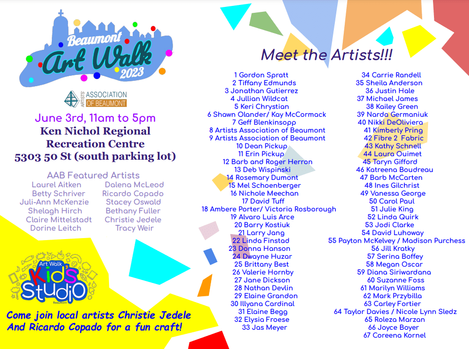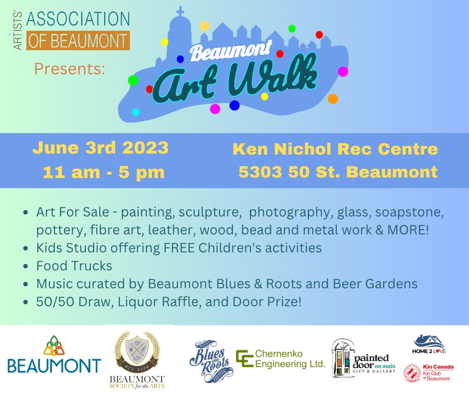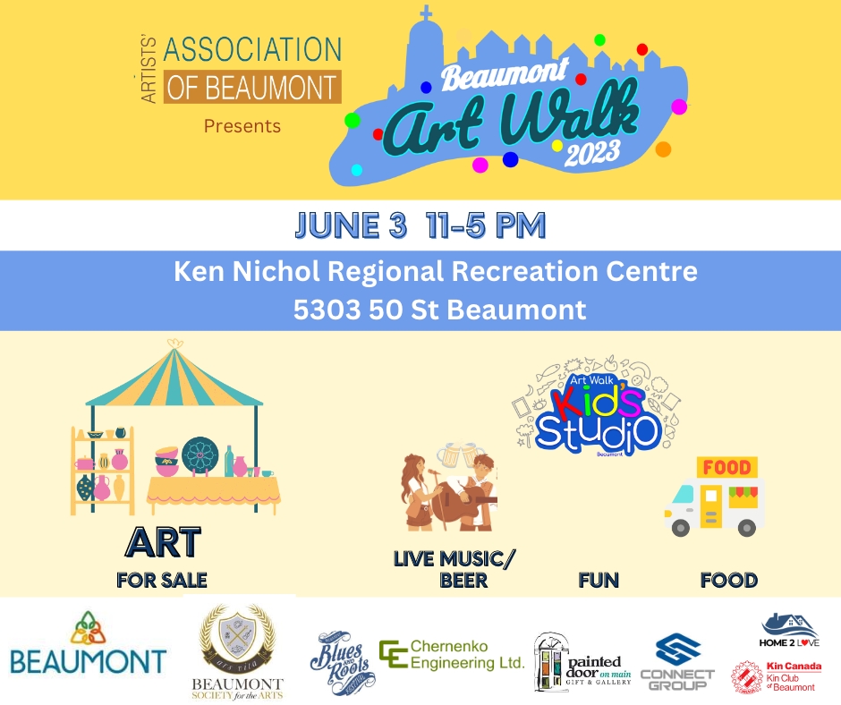 The Beaumont Art Walk is coming back! This outdoor event, rain or shine, will be on June 3rd 2023 from 11 – 5 pm, at the Ken Nichols Recreation Centre (South Park Lot) at 5303 – 50 St . With the huge success of last year’s inaugural event, the Artists’ Association of Beaumont (AAB) are preparing for the second annual Beaumont Art Walk to be even more popular, based on feedback and applications submitted.