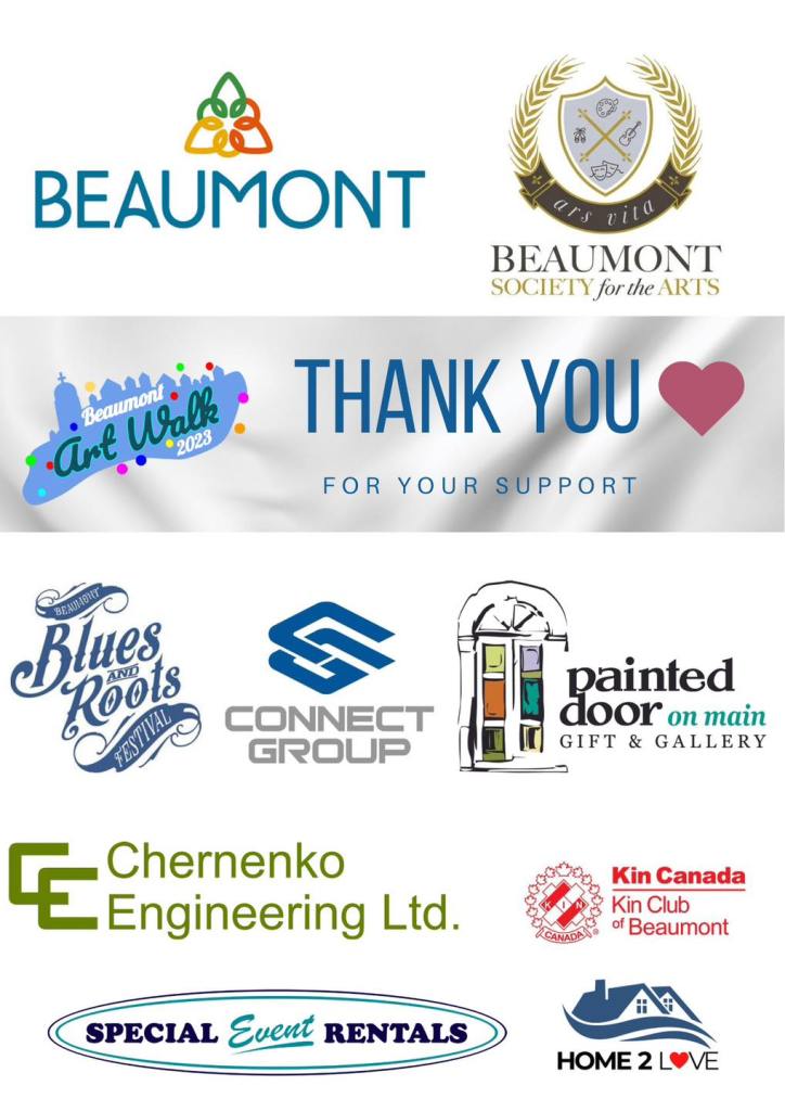 City of Beaumont; Beaumont Society For the Arts; Beaumont Blues and Roots Festival; Painted Door on Main; Chernenko Engineering Ltd; Connect Group; Kin Club of Beaumont; Home2Love; Special Event Rentals; Rig Hand Distillery; The Cooperators Beaumont; RuminariLive; Avenue Associates; Laura Heintzman; and LA Laser & Spa.