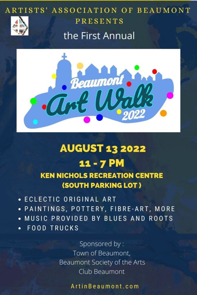 The Beaumont Art Walk will be held Saturday August 13th in downtown Beaumont in the Ken Nichols Rec Centre parking lot. The Artists’ Association of Beaumont is looking for volunteers to help make this new event a great success.
