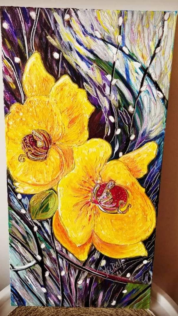 Jill Kratky – “Spring Blooms and Pussy Willows” acrylic with ink- 2 yellow flowers